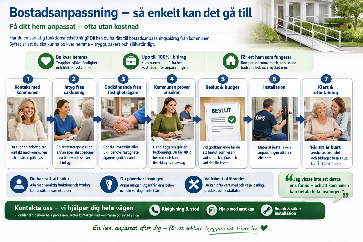 För dig som kund betyder det här något viktigt: det finns ett tydligt regelverk som ger möjlighet att få rätt åtgärder på plats när hemmet inte längre fungerar fullt ut efter dina behov. Det kan handla om exempelvis ramper, dörrautomatik, badrumsanpassningar eller andra lösningar som gör bostaden säkrare, mer tillgänglig och lättare att använda i vardagen.